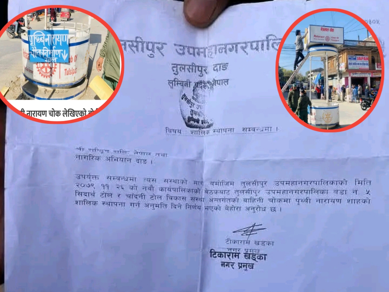 २०५४ सालमा तुलसीपुर नगरपालिकाका तत्कालीन जनप्रतिनिधिको बोर्ड बैठकले बाहिनी चोकलाई नेत्रलाल चोक राख्ने निर्णय गरेकाले सोही निर्णयलाई कार्यान्वयन गरेको अध्यक्ष भण्डारीले बताउनुभयो । तत्कालीन स्थानीय निकायले गरेको निर्णयलाई उल्टयाउने अधिकार बहालवाला मेयर खड्कालाई नभएको अध्यक्ष भण्डारीले दाबी गर्नुभयो । २०७९ फागुन २६ गतेको कार्यपालिका बैठकले पृथ्वी नारायण शाहको सालिक राख्ने निर्णय गरेको भन्दै २०८० जेठ ७ गते मेयर खड्काको हस्ताक्षर रहेको पत्र उपमहानगरपालिकाले राष्ट्रिय शक्ति नेपाल तथा नागरिक अभियान दाङलाई उपलब्ध गराएको थियो ।