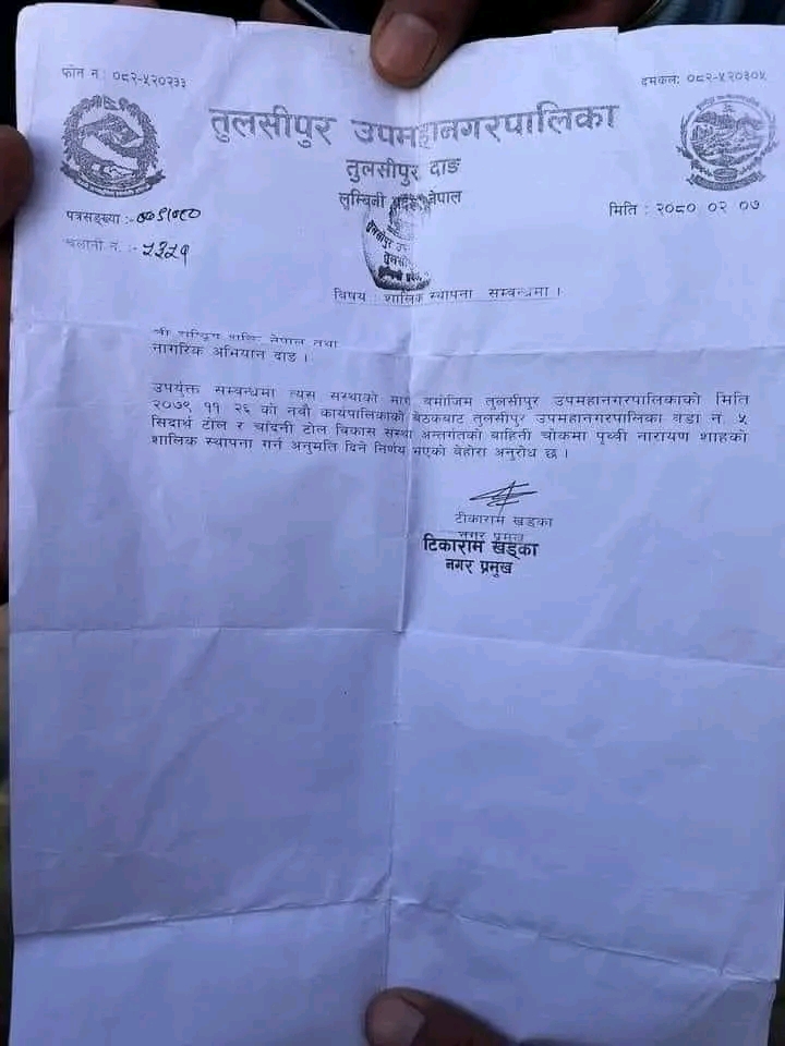 तुलसीपुर, २५ पुस । पृथ्वी नारायण चोक लेखिएको बोर्ड हटाएर तुलसीपुरको बाहिनी चोकलाई नेत्रलाल चोक नामाकरण गरिएको छ । तुलसीपुर उपमहानगरपालिका – ६ नम्बर वडाले पृथ्वी नारायण शाह लेखिएको बोर्ड हटाएर नेत्रलाल चोक नामाकरण गरेको हो । वडाको अनुमतिबिना तुलसीपुर उपमहानगरपालिका मेयर टिकाराम खड्कालाई पृथ्वी नारायण शाहको सालिक राख्न अनुमति दिने अधिकार नभएकाले बोर्ड हटाएको ६ नम्बर वडा अध्यक्ष दुजमान भण्डारीले बताउनुभयो । नगर प्रहरीको सहयोगमा बुधबार दिउँसो नेत्रलाल चोक लेखिएको स्टिकर टाँस गरिएको हो ।