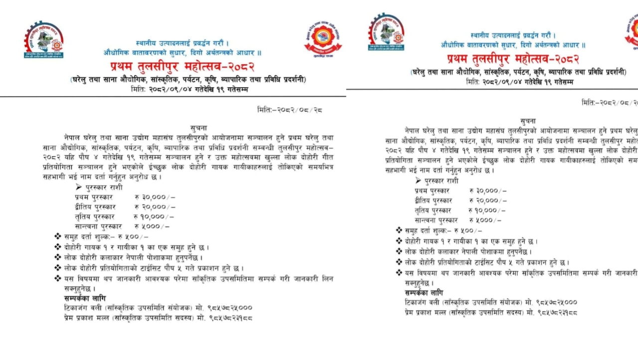 स्थानीय उत्पादनलाई प्रवर्द्धन गर्ने उद्देश्यका साथ आयोजना हुन लागेको प्रथम तुलसीपुर महोत्सव–२०८२ मा खुला लोकदोहोरी गीत प्रतियोगिता सञ्चालन हुने भएको छ। नेपाल घरेलु तथा साना उद्योग महासंघ तुलसीपुरको आयोजनामा हुने महोत्सव आगामी पौष ४ गतेदेखि १९ गतेसम्म सञ्चालन हुनेछ।