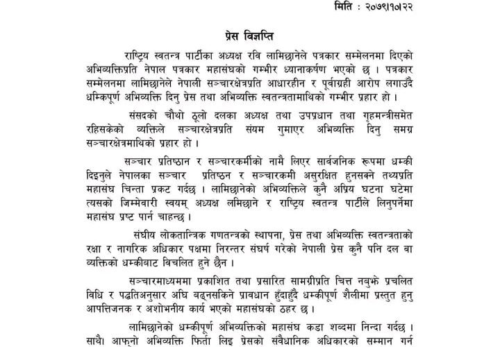 लामिछानेको धम्कीपूर्ण अभिव्यक्तिको महासंघ कडा शब्दमा निन्दा गर्दछ